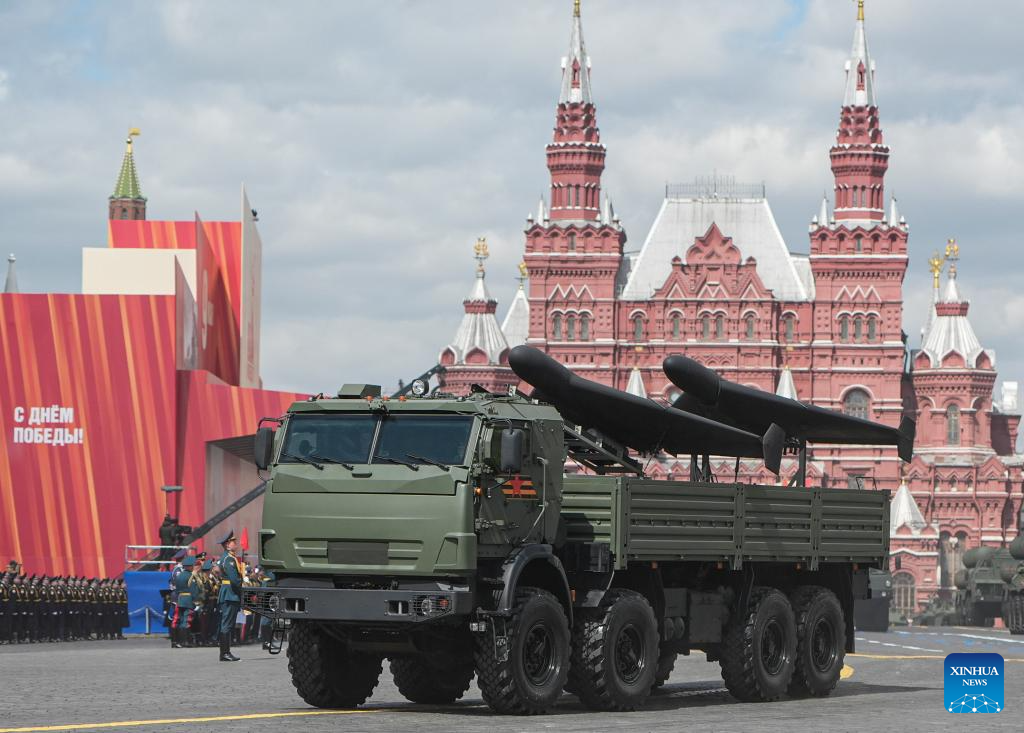 An armored vehicle carrying drones marches during a grand parade marking the 80th anniversary of the victory in the Soviet Union's Great Patriotic War in Moscow, Russia, May 9, 2025. (Xinhua/Lai Xiangdong)
