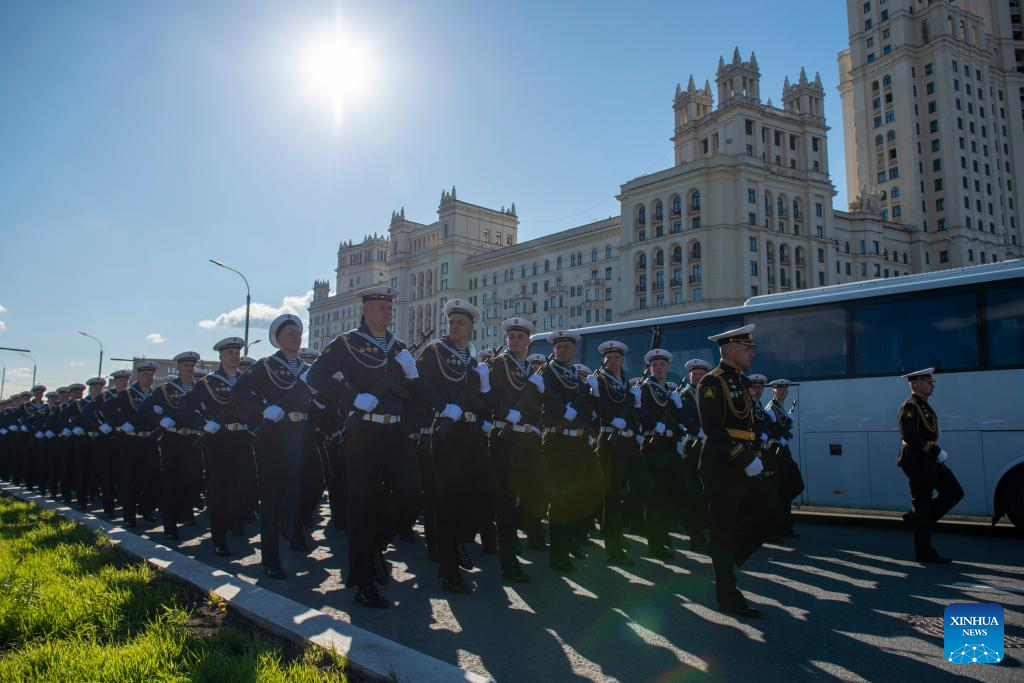 Members of an honor guard prepare to attend a grand parade marking the 80th anniversary of the victory in the Soviet Union's Great Patriotic War in Moscow, Russia, May 9, 2025. (Xinhua/Lai Xiangdong)