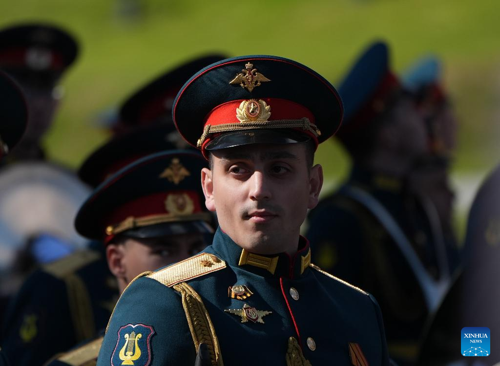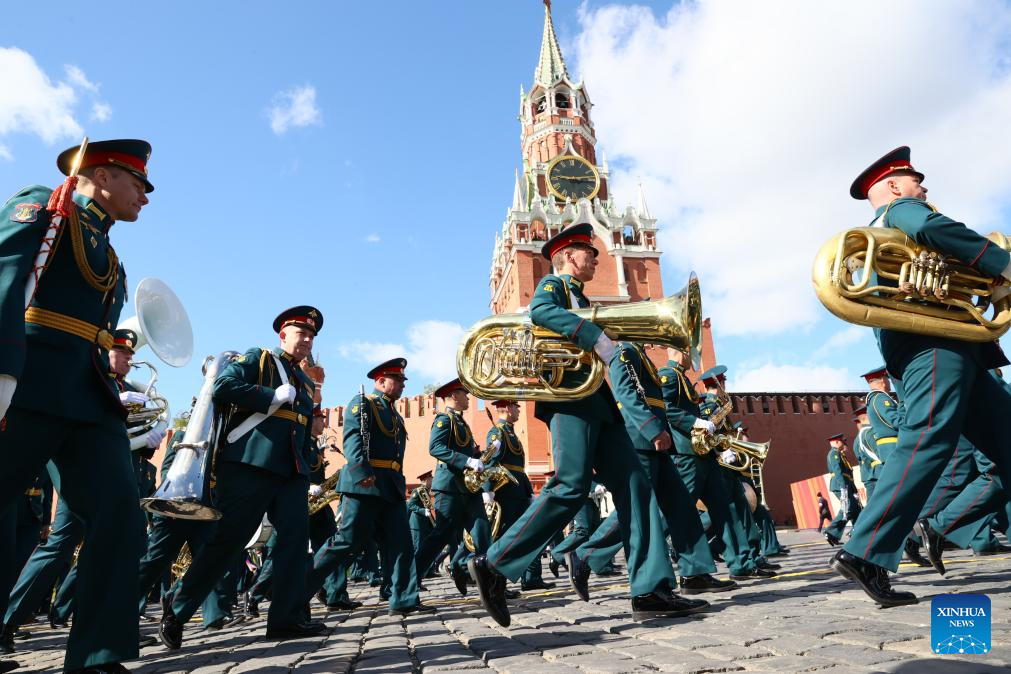 A military band prepares to attend a grand parade marking the 80th anniversary of the victory in the Soviet Union's Great Patriotic War in Moscow, Russia, May 9, 2025. (Xinhua/Lai Xiangdong)