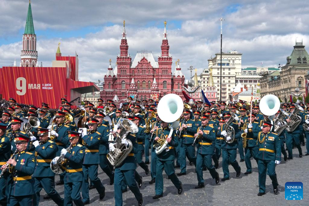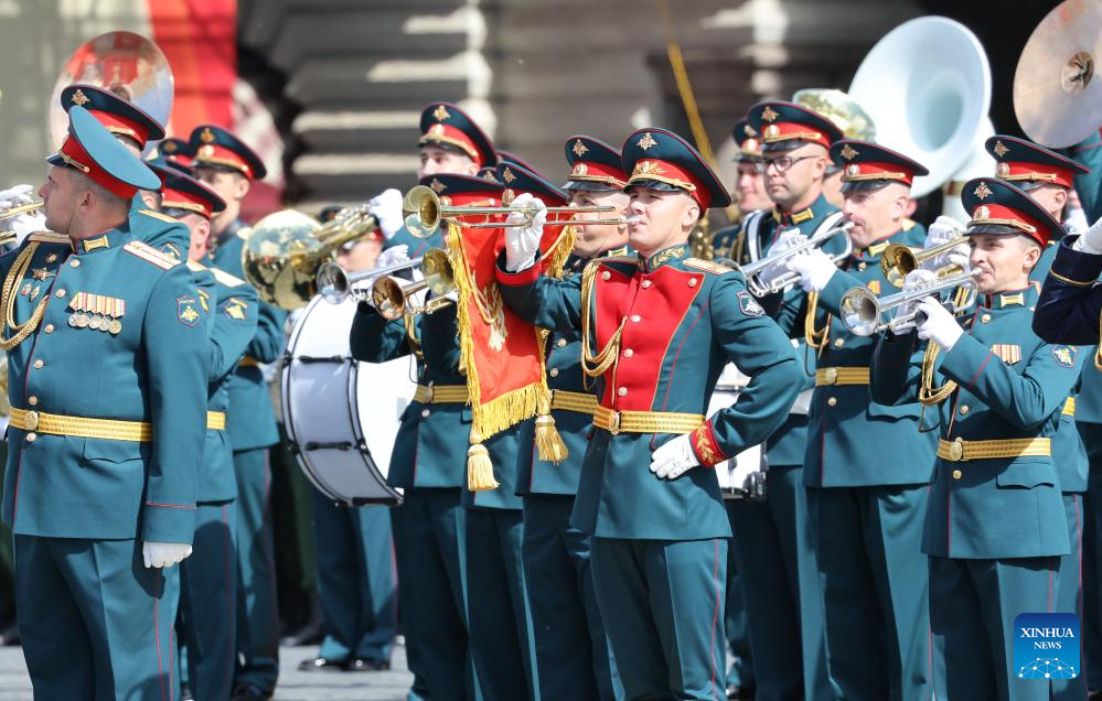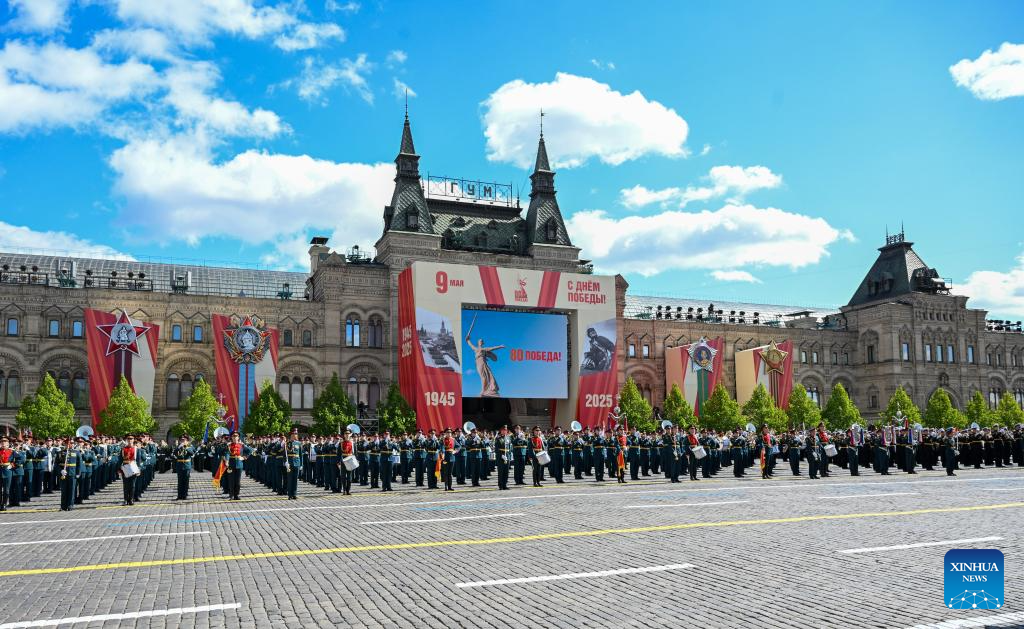 A military band attends a grand parade marking the 80th anniversary of the victory in the Soviet Union's Great Patriotic War in Moscow, Russia, May 9, 2025. (Xinhua/Lai Xiangdong)