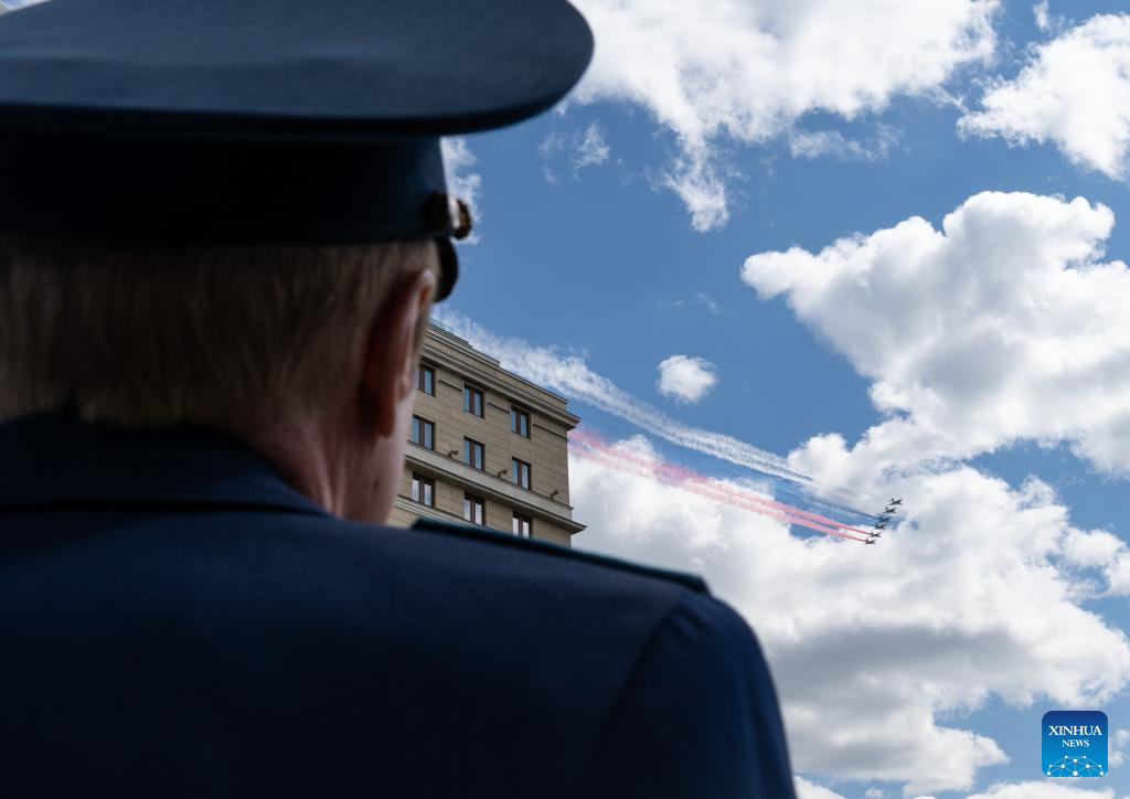 Aircraft fly in formation during a grand parade marking the 80th anniversary of the victory in the Soviet Union's Great Patriotic War in Moscow, Russia, May 9, 2025. (Xinhua/Lai Xiangdong)