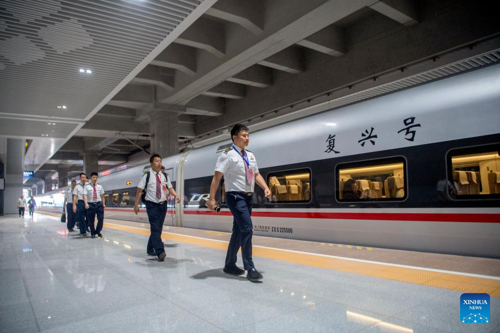 The high-speed test train departs from Chongqing East Railway Station in southwest China's Chongqing Municipality, May 9, 2025. With the departure of the high-speed test train from Chongqing East Railway Station, the joint debugging and test of Chongqing section of the newly-built Chongqing-Xiamen high-speed railway were successfully completed and started its test operation on Friday. (Xinhua/Tang Yi)