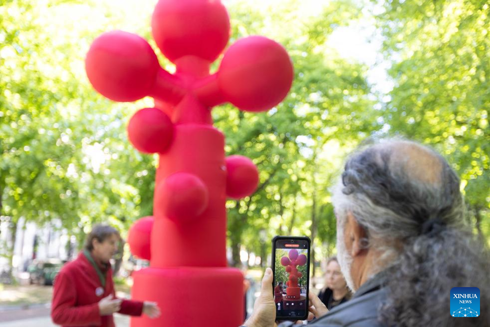 Visitors view an artwork during the BlowUp Art exhibition, an open-air display of gigantic inflatable artworks, at the Pulchri Studio in The Hague, the Netherlands, May 9, 2025. The exhibition will last util June 11. (Photo by Sylvia Lederer/Xinhua)