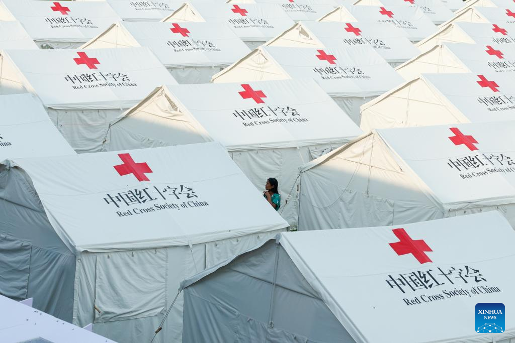 This photo taken on May 10, 2025 shows China-donated tents in a relief shelter in Mandalay, Myanmar. (Xinhua/Myo Kyaw Soe)