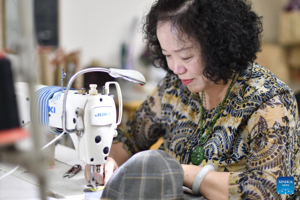 Ma Wanlan, an inheritor of Shengxifu hat making technique, sews a hat at a Shengxifu workshop in Beijing, capital of China, May 4, 2025.