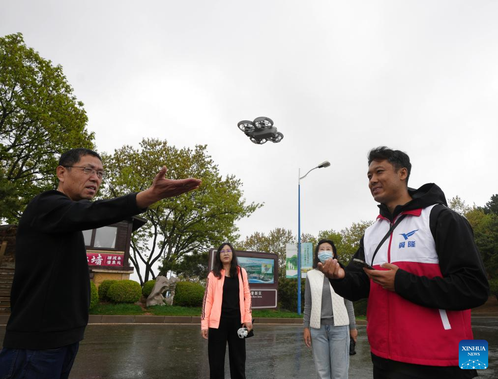 A staff member (R) of Liaoning Yilong General Aviation Co., Ltd. helps tourists try a shared drone at a scenic area in Dalian, northeast China's Liaoning Province, May 9, 2025.