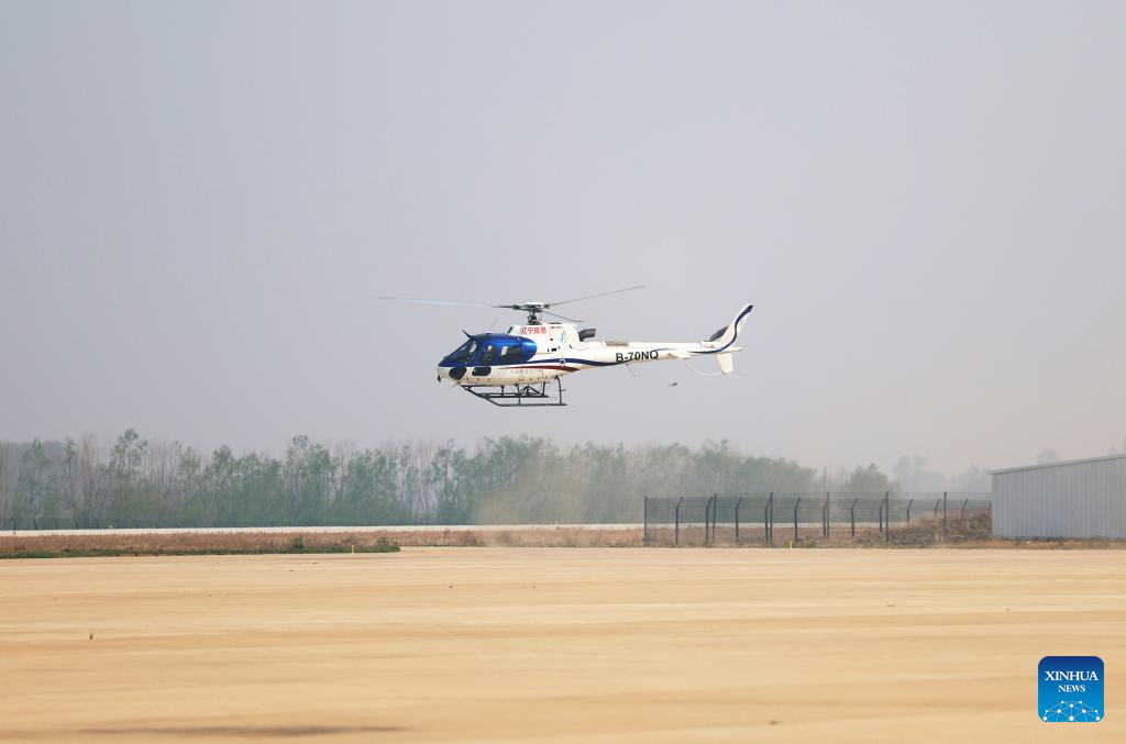 A helicopter takes off from the Shenyang general aviation industry base for forest protection operations in Faku County, in Shenyang, northeast China's Liaoning Province, April 26, 2025.
