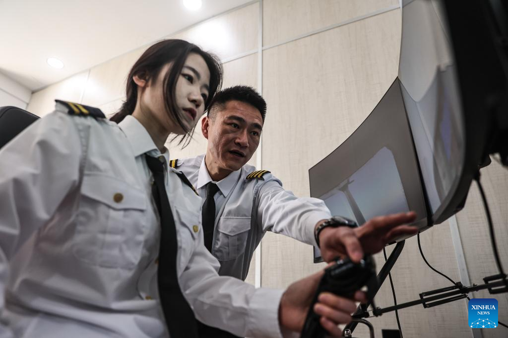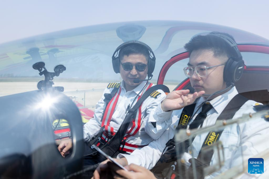 A trainee (L) attends a light sport aircraft flight training session at Liaoning Zhongzhi Yisheng Aviation Flight Academy in Faku County, in Shenyang, northeast China's Liaoning Province, April 25, 2025.