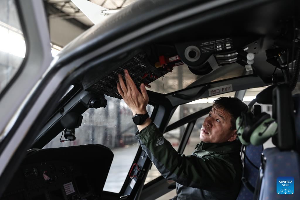 The general manager of Liaoning Tongfei General Aviation Co., Ltd. checks a helicopter for emergency rescue operations, aerial photography and aerial surveying at a hangar in Faku County, in Shenyang, northeast China's Liaoning Province, April 25, 2025.