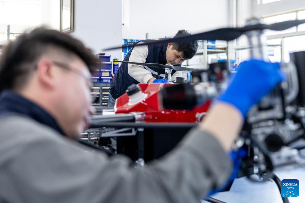 Engineers of Optimal Aerospace Science and Industry Group Co., Ltd. check a drone for emergency and firefighting operations in Shenbei New District of Shenyang, northeast China's Liaoning Province, April 25, 2025.