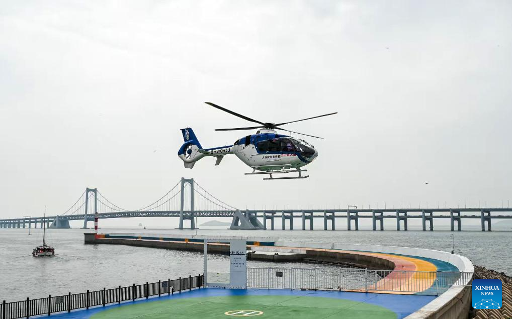 A helicopter for sightseeing flies in Dalian, northeast China's Liaoning Province, April 26, 2025.