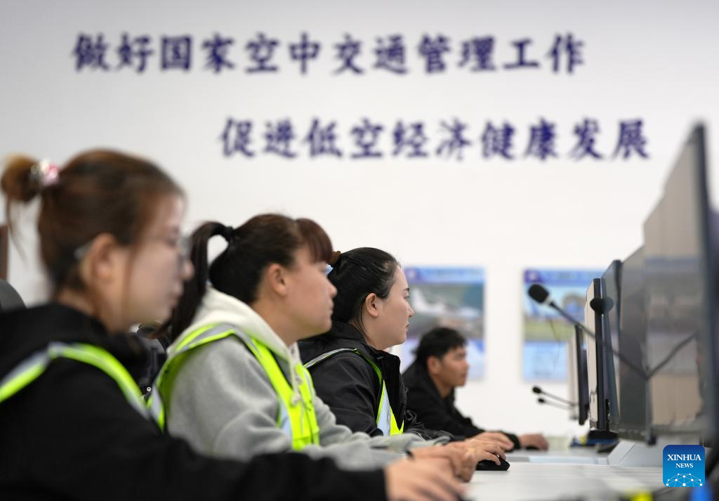 Staff members work at the low-altitude flight service center of the Shenyang general aviation industry base in Faku County, in Shenyang, northeast China's Liaoning Province, April 25, 2025.