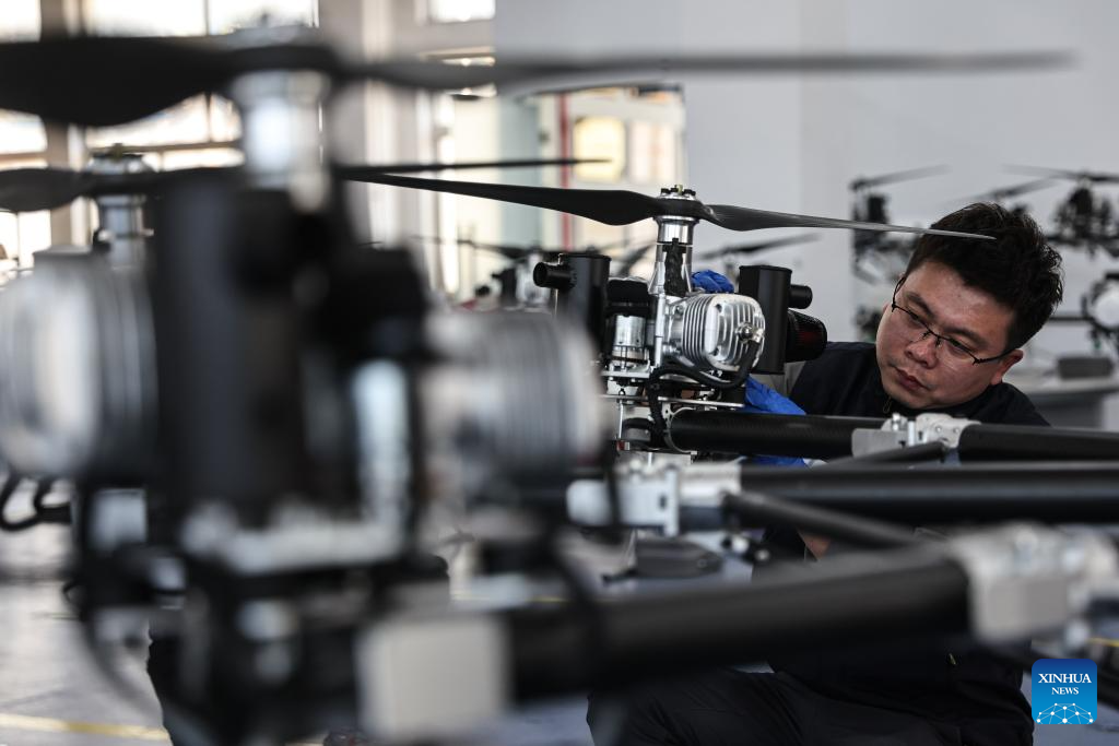 An engineer of Optimal Aerospace Science and Industry Group Co., Ltd. checks a drone for emergency and firefighting operations in Shenbei New District of Shenyang, northeast China's Liaoning Province, April 25, 2025.