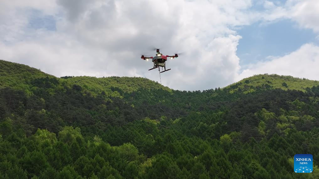 A lighting drone conducts illumination operations at a forest farm in Haicheng City, northeast China's Liaoning Province, May 6, 2025.