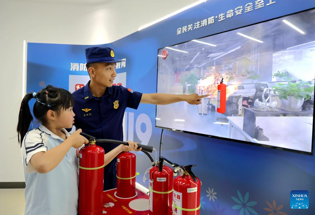 A kid practices simulated firefighting training under the guidance of a firefighter in Laodian Town, Yangxin County, Binzhou City, east China's Shandong Province, May 11, 2025. China observes the National Disaster Prevention and Reduction Day on May 12 each year. Various publicity, drill and training activities are carried out across China to improve public awareness in scientific disaster prevention and self-rescue. (Photo by Chu Baorui/Xinhua)