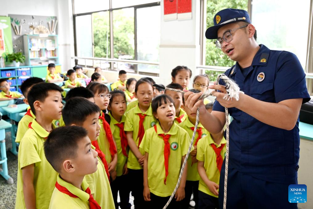 A rescuer introduces the proper use of escape ropes to students at a primary school in Wuyi County, east China's Zhejiang Province, May 9, 2025. China observes the National Disaster Prevention and Reduction Day on May 12 each year. Various publicity, drill and training activities are carried out across China to improve public awareness in scientific disaster prevention and self-rescue. (Photo by Zhang Jiancheng/Xinhua)