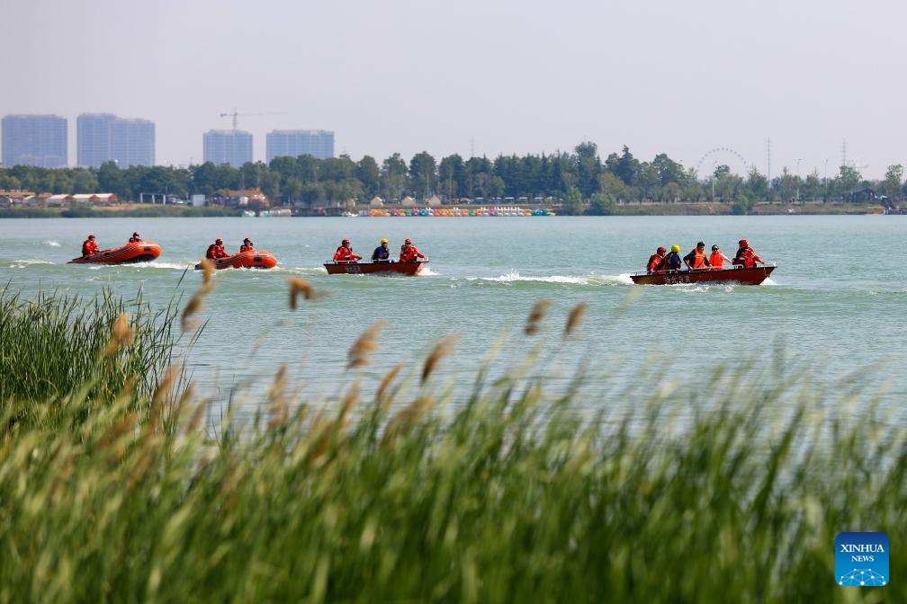 Rescuers participate in a water rescue drill at Lvjin Lake in Huaibei City, east China's Anhui Province, May 11, 2025. China observes the National Disaster Prevention and Reduction Day on May 12 each year. Various publicity, drill and training activities are carried out across China to improve public awareness in scientific disaster prevention and self-rescue. (Photo by Wan Shanchao/Xinhua)