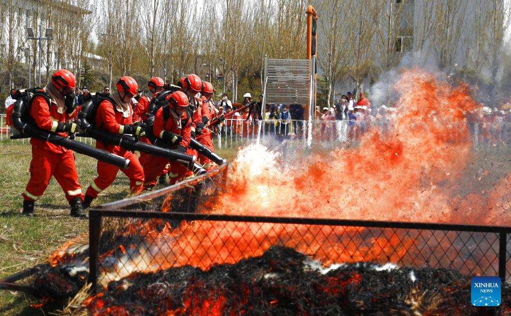 Firefighters demonstrate team-based firefighting operations to the public in Daqing City, northeast China's Heilongjiang Province, May 9, 2025. China observes the National Disaster Prevention and Reduction Day on May 12 each year. Various publicity, drill and training activities are carried out across China to improve public awareness in scientific disaster prevention and self-rescue. (Photo by Xue Gang/Xinhua)