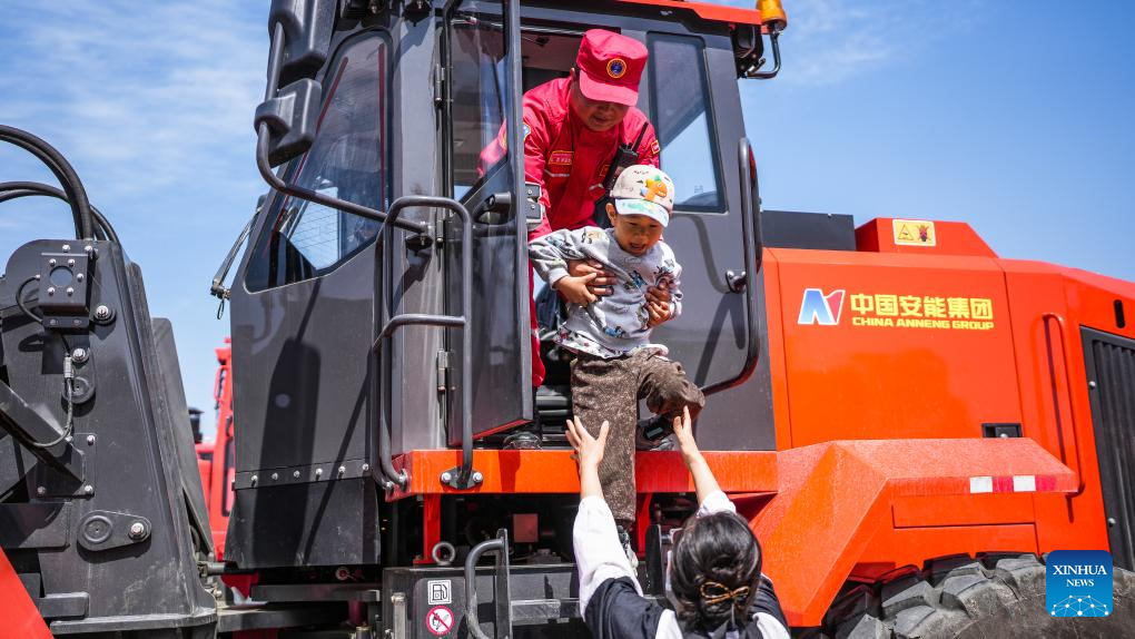 A kid tries out a special engineering vehicle during an activity on disaster prevention and reduction held in Guiyang, southwest China's Guizhou Province, May 11, 2025. China observes the National Disaster Prevention and Reduction Day on May 12 each year. Various publicity, drill and training activities are carried out across China to improve public awareness in scientific disaster prevention and self-rescue. (Xinhua/Tao Liang)