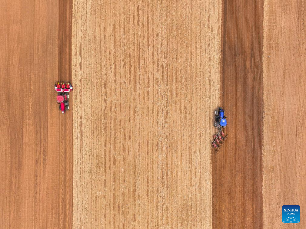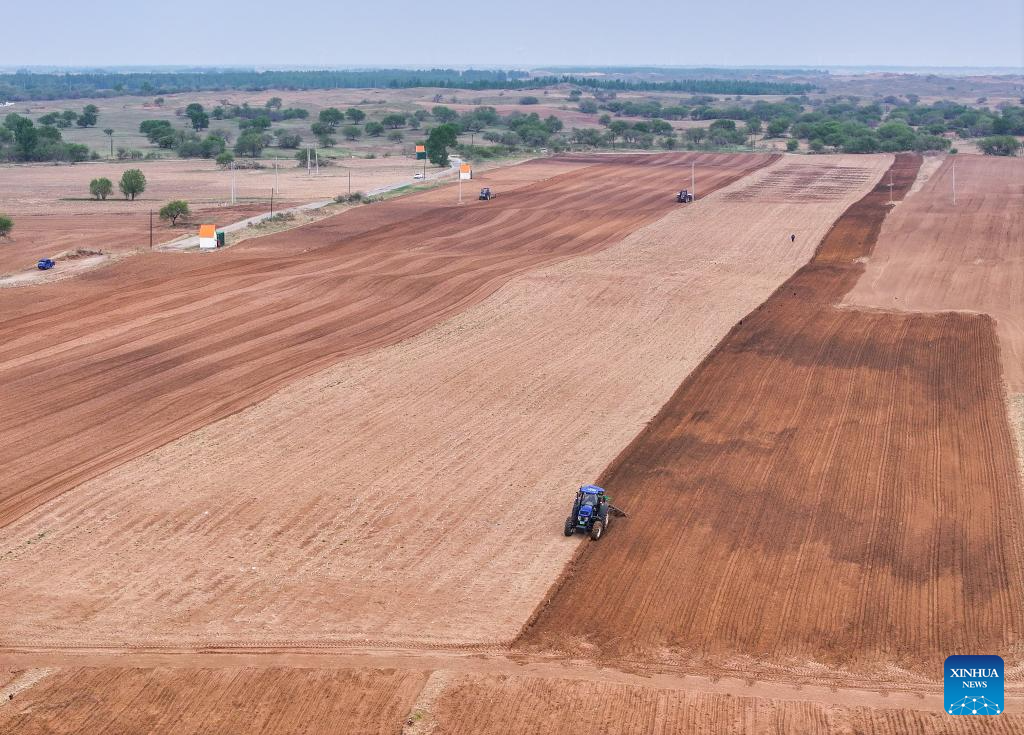 An aerial drone photo taken on May 9, 2025 shows farmers operating tractors equipped with Beidou navigation system for plowing in Horqin Left Wing Rear Banner of Tongliao City, north China's Inner Mongolia Autonomous Region. (Xinhua/Lian Zhen)