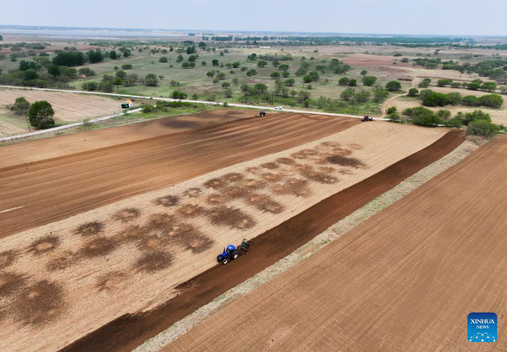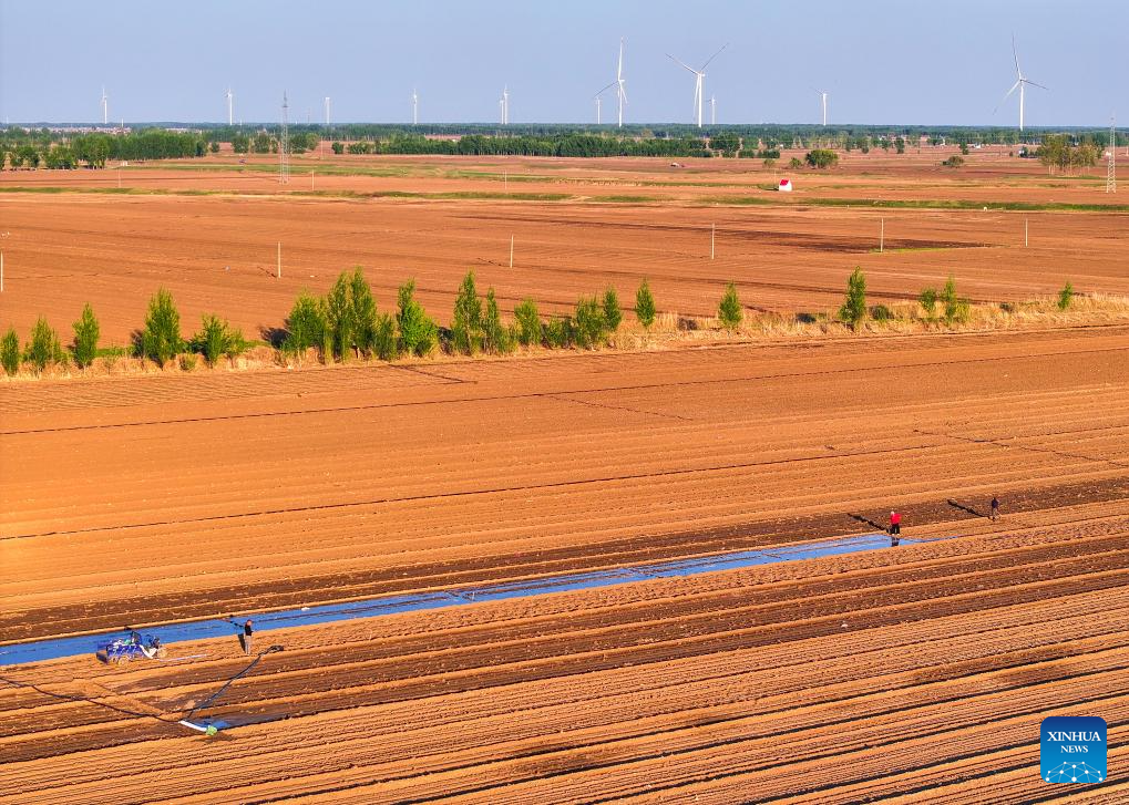 An aerial drone photo taken on May 10, 2025 shows farmers laying out drip lines in the fields in Kunduhua village in Qianjiadian Town of Horqin District, Tongliao City, north China's Inner Mongolia Autonomous Region. Benefiting from May's timely rainfalls, Tongliao, a granary of eastern Inner Mongolia, has entered the peak period of corn sowing. It is reported that Tongliao's corn planting area in 2025 is expected to reach 20 million mu (approximately 1.33 million hectares), an increase of 180,000 mu (12,000 hectares) compared to the previous year. (Xinhua/Lian Zhen)