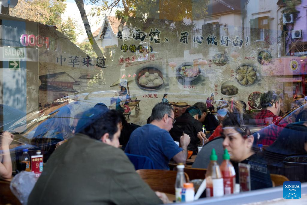 People enjoy food at a restaurant in the Chinatown in Buenos Aires, Argentina, May 10, 2025. In 2009, the archway of the Chinatown in Buenos Aires was officially completed. Nowadays, the Chinatown has become an important tourist attraction in the local area, attracting many people to experience the charm of Eastern culture. (Xinhua/Meng Dingbo)