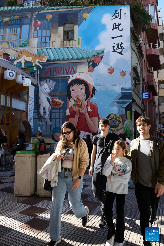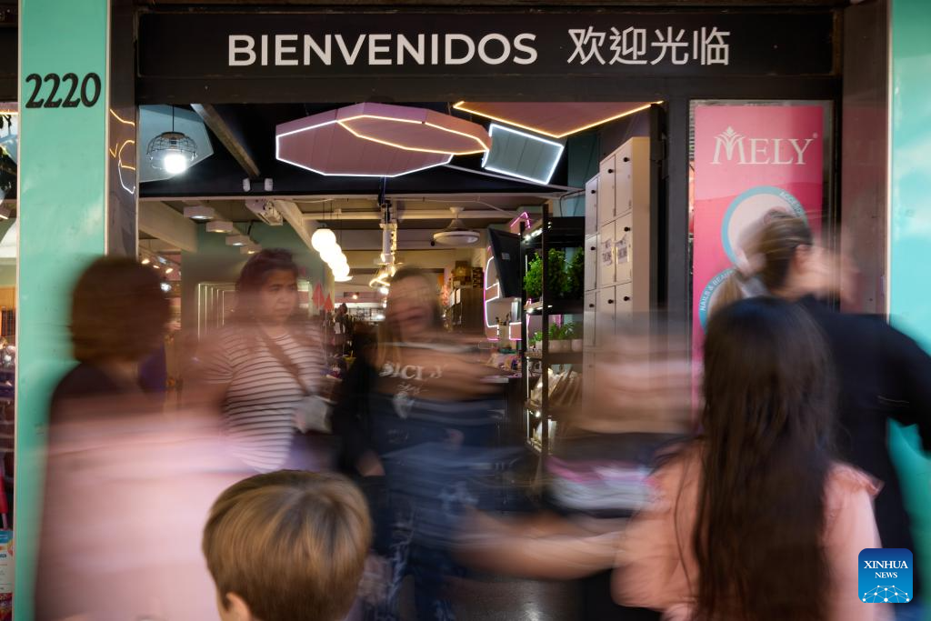 People walk past a Chinese supermarket in the Chinatown in Buenos Aires, Argentina, May 10, 2025. In 2009, the archway of the Chinatown in Buenos Aires was officially completed. Nowadays, the Chinatown has become an important tourist attraction in the local area, attracting many people to experience the charm of Eastern culture. (Xinhua/Meng Dingbo)