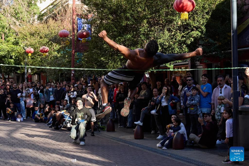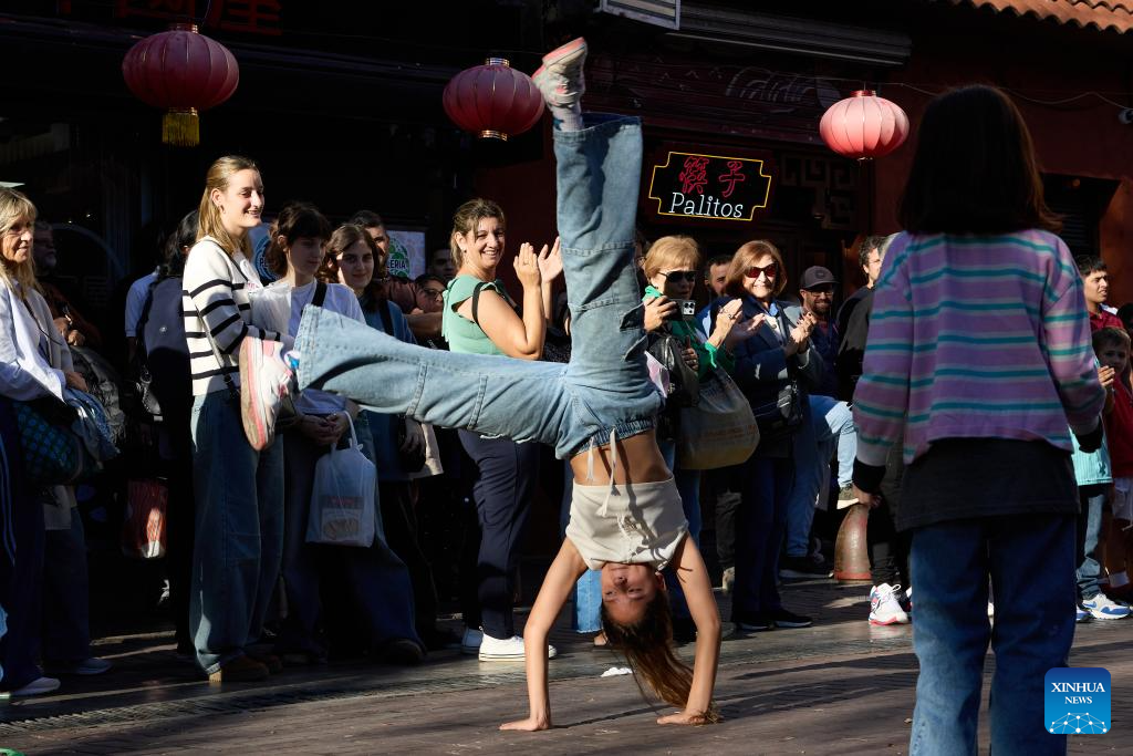 People watch the performance of a street artist in the Chinatown in Buenos Aires, Argentina, May 10, 2025. In 2009, the archway of the Chinatown in Buenos Aires was officially completed. Nowadays, the Chinatown has become an important tourist attraction in the local area, attracting many people to experience the charm of Eastern culture. (Xinhua/Meng Dingbo)