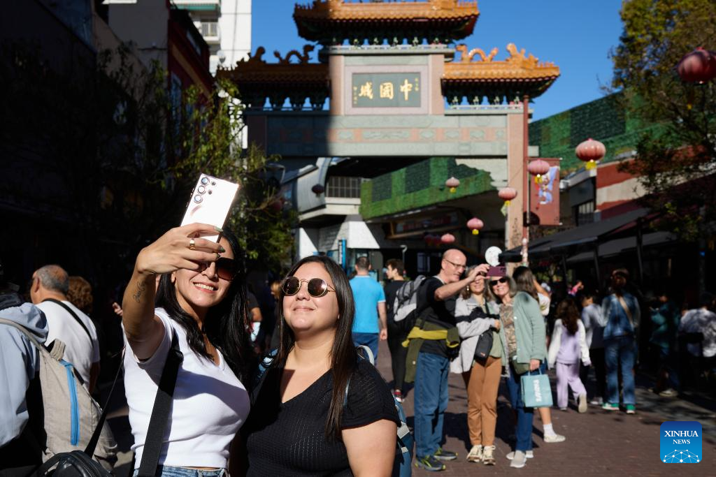 People pose for selfies in front of the archway of the Chinatown in Buenos Aires, Argentina, May 10, 2025. In 2009, the archway of the Chinatown in Buenos Aires was officially completed. Nowadays, the Chinatown has become an important tourist attraction in the local area, attracting many people to experience the charm of Eastern culture. (Xinhua/Meng Dingbo)
