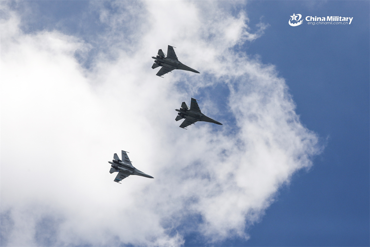 Three J-16 multi-role fighter jets attached to an aviation brigade with the air force under the Chinese PLA Eastern Theater Command fly in formation during a flight training exercise on April 25, 2025. (eng.chinamil.com.cn/Zheng Hanyi)