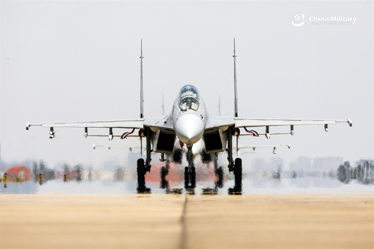A J-16 multi-role fighter jet attached to an aviation brigade with the air force under the Chinese PLA Eastern Theater Command retracts its landing gears after taking off during a flight training exercise on April 25, 2025. (eng.chinamil.com.cn/Zheng Hanyi)
