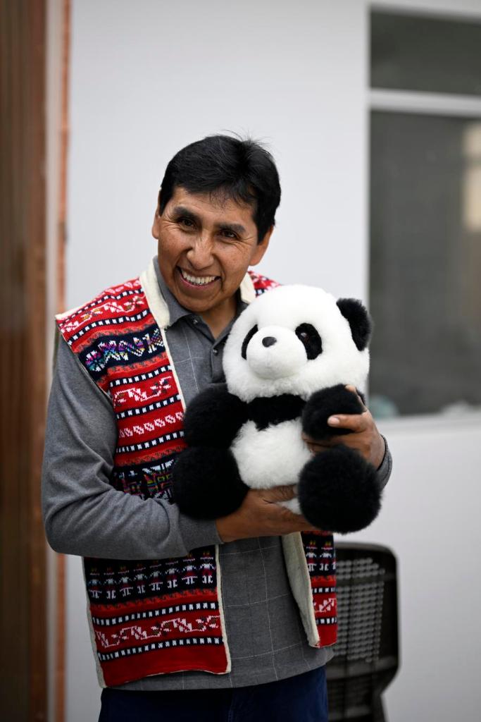 Peruvian craftsman Oswaldo Mamani holds a panda toy made from alpaca wool in Arequipa, Peru, June 20, 2024. (Xinhua/Li Muzi)
