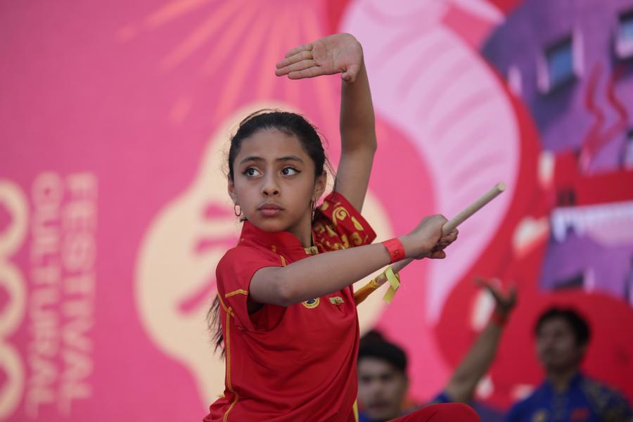 A girl performs during the third edition of the Chinese New Year Cultural Festival at the National Center for the Arts (CENART) in Mexico City, capital of Mexico, Feb. 3, 2024. (Photo by Francisco Canedo/Xinhua)