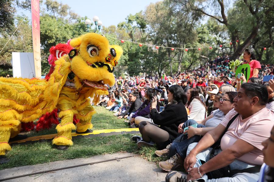 People watch a lion dance performance at the fourth edition of the Chinese New Year culture festival, in Mexico City, Mexico, Jan. 25, 2025. (Xinhua/Li Mengxin)