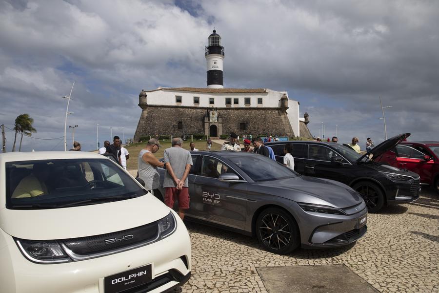 Visitors watch BYD electric vehicles in Salvador, the capital of Bahia, Brazil, July 4, 2023. (Xinhua/Wang Tiancong)