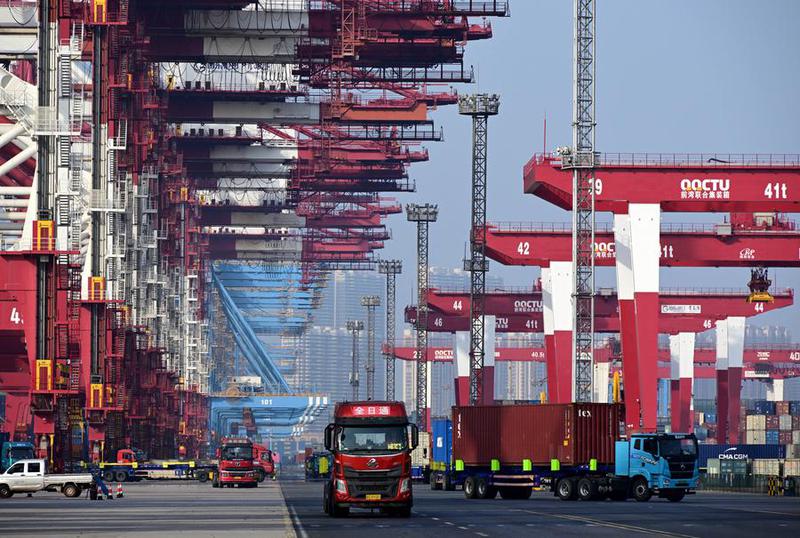 This photo taken on April 30, 2025 shows trucks at a cargo dock of Qingdao Port in Qingdao, East China's Shandong province. (Photo/Xinhua)