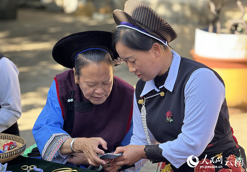 A Bai ethnic woman adjusts an embroidered accessory on another woman in Diannan town, Heqing county, southwest China's Yunnan Province. (Photo/Jiang Ze)