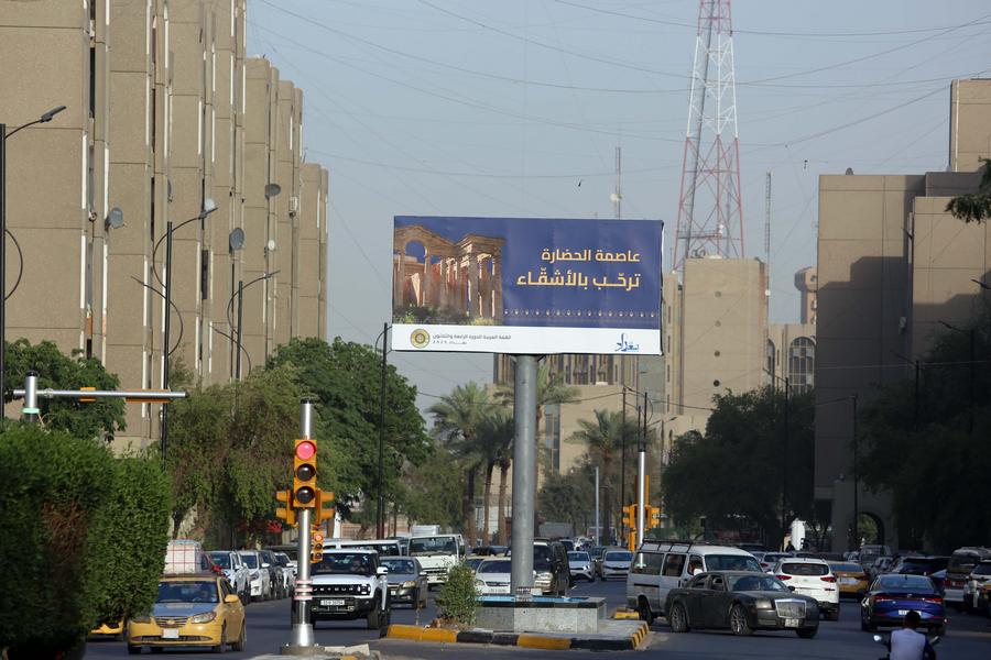 A billboard for the 34th Arab League Summit is seen on a street in Baghdad, Iraq, May 12, 2025. (Xinhua/Khalil Dawood)