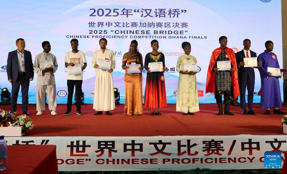 Prize-winners pose for a group photo at the Ghana division final of the 24th "Chinese Bridge" Chinese proficiency contest in Cape Coast, Ghana, May 16, 2025. The final was held on Friday in Cape Coast of Ghana's Central Region, with many young talents capturing the hearts and minds of the audience. (Photo by Seth/Xinhua)