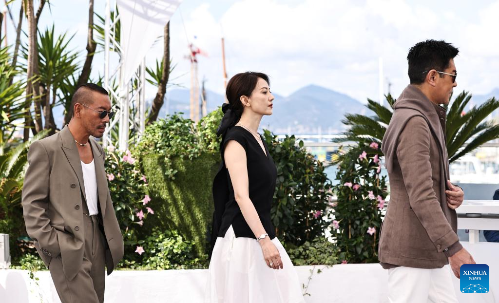 Director, screenwriter and producer Juno Mak, actress Gao Yuanyuan and actor Louis Koo (L-R) arrive for the photocall of the film "Fung Lam Fo Saan (Sons of the Neon Night)" at the 78th edition of the Cannes Film Festival in Cannes, southern France, on May 17, 2025. (Xinhua/Gao Jing)