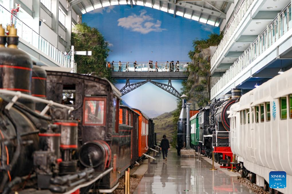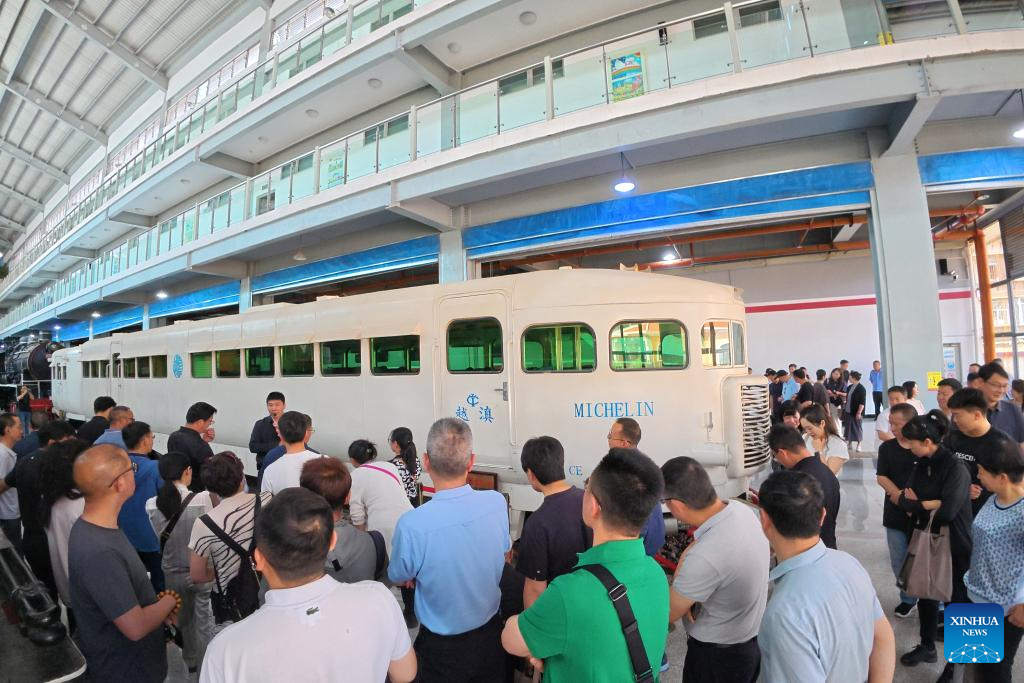 People visit Yunnan Railway Museum in Kunming, southwest China's Yunnan Province, May 16, 2025. Housed in Kunming North Railway Station, the Yunnan Railway Museum takes the century-long development history of Yunnan railway as the leading story line to narrate the frog-leaping evolution railway gauge standards from meter gauge to inch gauge, and standard gauge, as well as railway technologies from steam locomotives to high-speed rails. (Xinhua/Chen Xinbo)