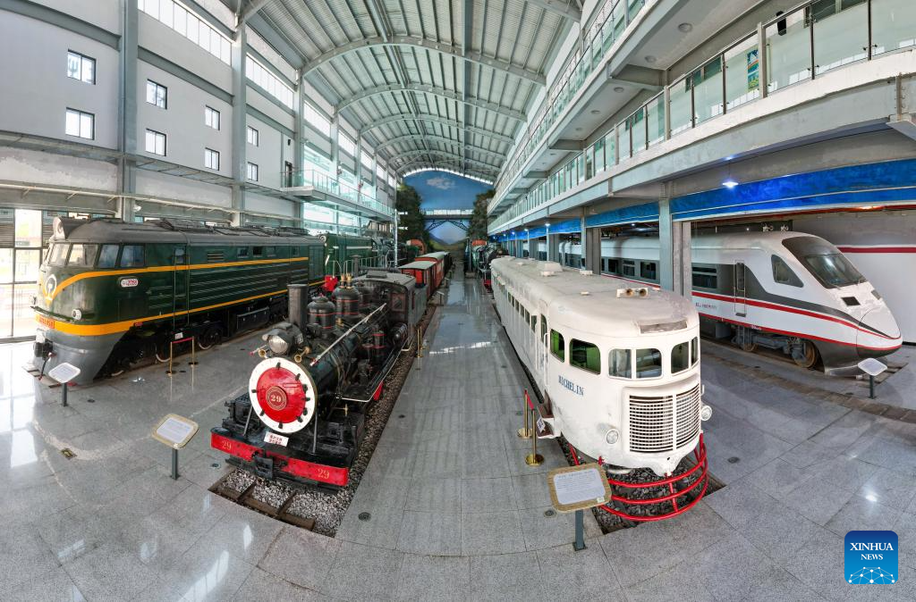 A panoramic drone photo shows trains from different period of time at Yunnan Railway Museum in Kunming, southwest China's Yunnan Province, May 14, 2025. Housed in Kunming North Railway Station, the Yunnan Railway Museum takes the century-long development history of Yunnan railway as the leading story line to narrate the frog-leaping evolution railway gauge standards from meter gauge to inch gauge, and standard gauge, as well as railway technologies from steam locomotives to high-speed rails. (Xinhua/Chen Xinbo)
