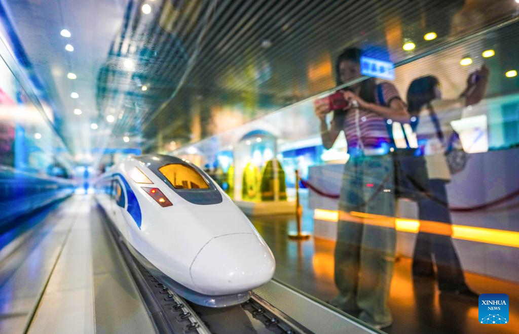A visitor takes photos of a Fuxing bullet train model at Yunnan Railway Museum in Kunming, southwest China's Yunnan Province, May 16, 2025. Housed in Kunming North Railway Station, the Yunnan Railway Museum takes the century-long development history of Yunnan railway as the leading story line to narrate the frog-leaping evolution railway gauge standards from meter gauge to inch gauge, and standard gauge, as well as railway technologies from steam locomotives to high-speed rails. (Xinhua/Chen Xinbo)