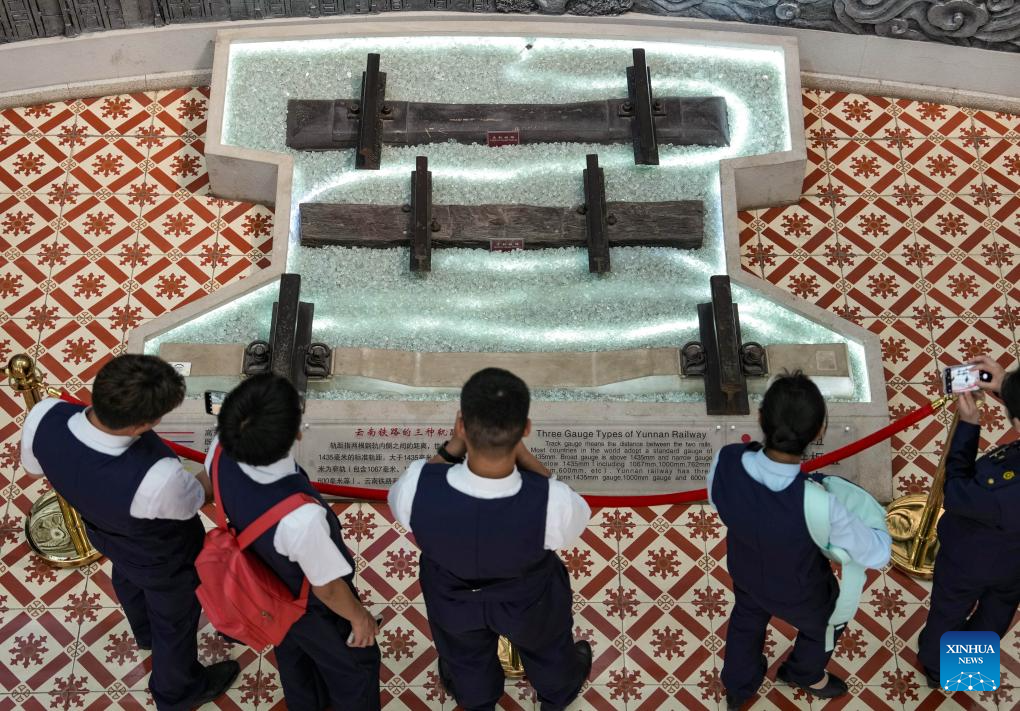 People visit Yunnan Railway Museum in Kunming, southwest China's Yunnan Province, May 14, 2025. Housed in Kunming North Railway Station, the Yunnan Railway Museum takes the century-long development history of Yunnan railway as the leading story line to narrate the frog-leaping evolution railway gauge standards from meter gauge to inch gauge, and standard gauge, as well as railway technologies from steam locomotives to high-speed rails. (Xinhua/Chen Xinbo)