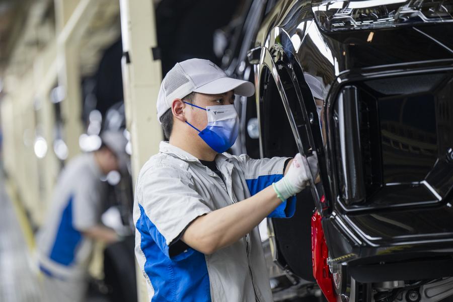 A worker works at an assembly line of Voyah, a Chinese NEV brand, in Wuhan, central China's Hubei Province, April 9, 2025. (Xinhua/Wu Zhizun)