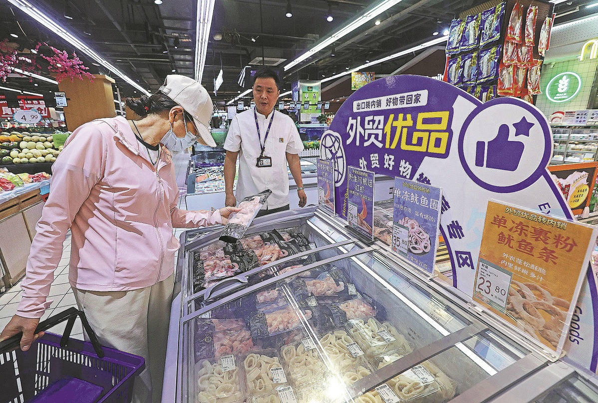 A customer selects seafood products originally produced for export at a supermarket in Hangzhou, Zhejiang province, on April 23. LIN YUNLONG/FOR CHINA DAILY