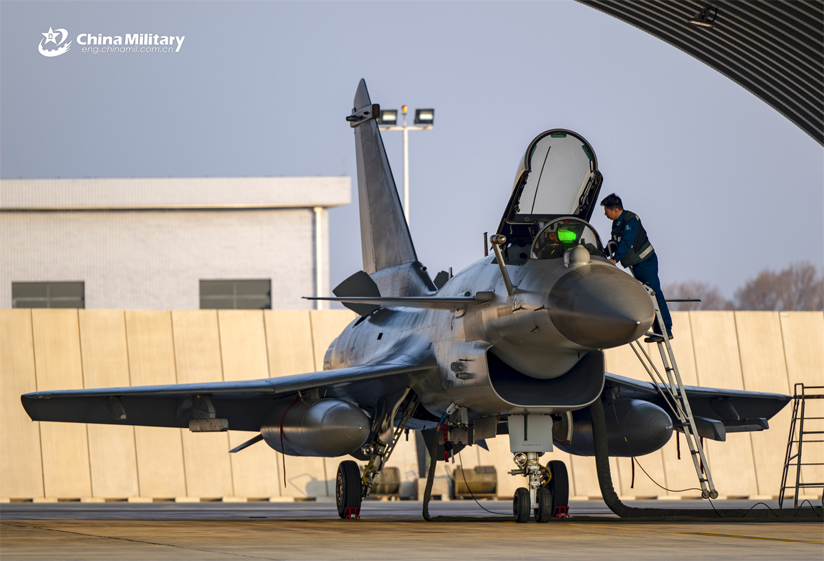 A maintenance man assigned to an aviation brigade of the air force under the Chinese PLA Southern Theater Command conducts pre-flight inspections on a J-10 fighter jet prior to a day-and-night flight training exercise. (eng.chinamil.com.cn/Shang Jieyan)