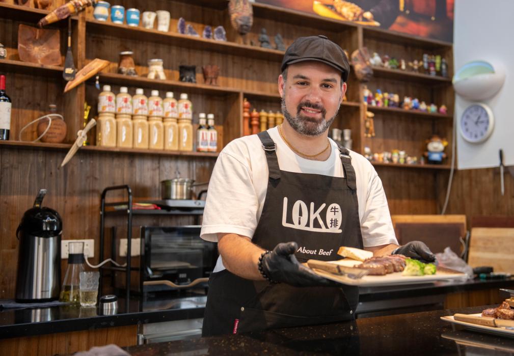 Gabriel Martin, a businessman from Uruguay, displays the steak he just cooked at LOKO steakhouse in the ancient city of Wuhu in Wuhu City, east China's Anhui Province, June 20, 2024. (Xinhua/Fu Tian)