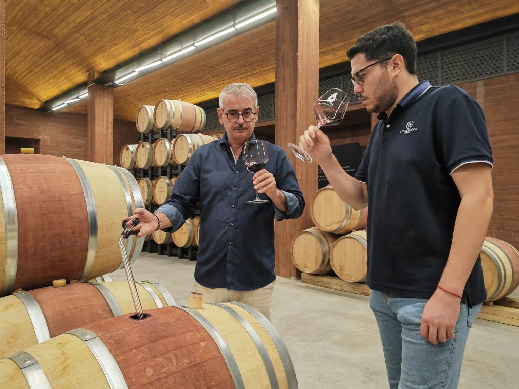 Nicolas Billot-Grima (L), co-founder of Stone and Moon Treasury Wine Estates, tastes wine with Federico Carabajal, a winemaker from Argentina, at a cellar in Qingtongxia City, northwest China's Ningxia Hui Autonomous Region, Aug. 7, 2024. (Xinhua/Liu Hai)