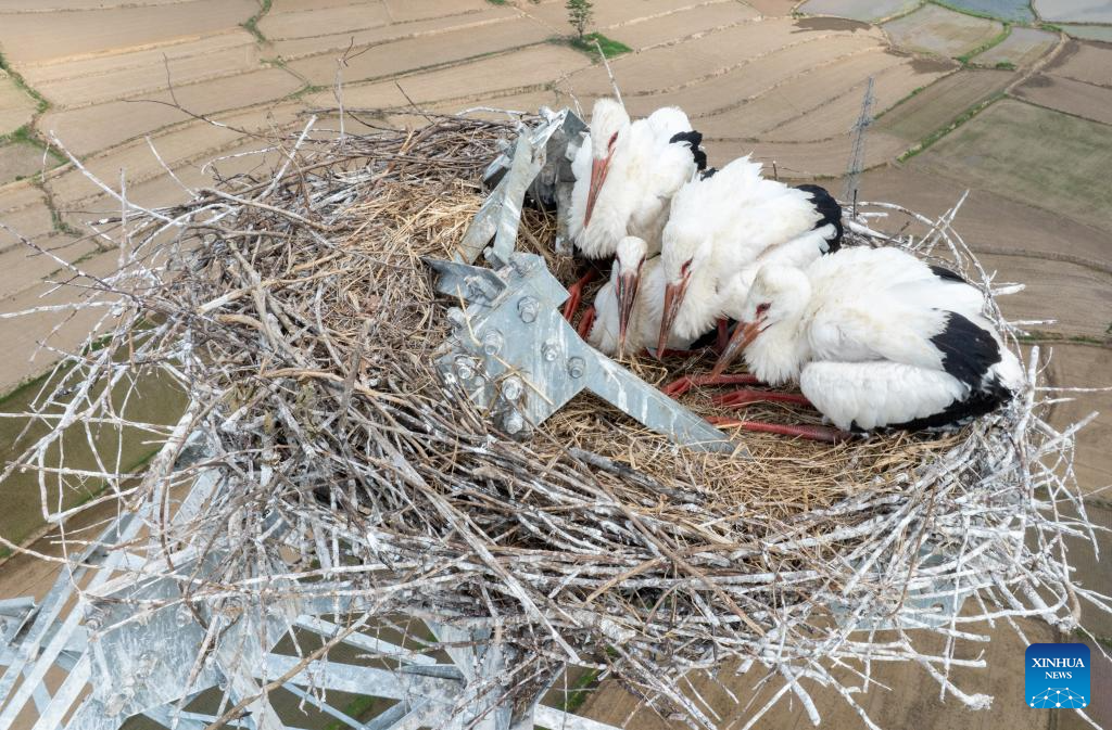 An aerial drone photo taken on May 21, 2025 shows oriental white storks taking care of the nestlings on top of a transmission tower in Huoqiu County, east China's Anhui Province. In early May this year, workers discovered a nest of oriental white stork, a migratory bird under first-class state protection, on the newly-built transmission tower. The State Grid Anhui Electric Power Co., Ltd. has installed high-definition cameras near the nest, assigned designated staff to track and protect the oriental white storks, and postponed the construction progress according to the breeding timeline of the storks. (Xinhua/Zhou Mu)
